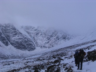 Walking up towards Coire Ardair. Easy Gully is the prominent center snow filled gully